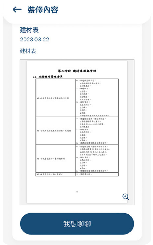 App 將會主動追蹤第 1、3、6 個月和第 1 年的房屋使用狀況,屋主更能從平台上查詢到整個設計空間內所有建材、品牌、維護方式、保固範圍等,不怕保證書遺失、找不到修繕師傅。